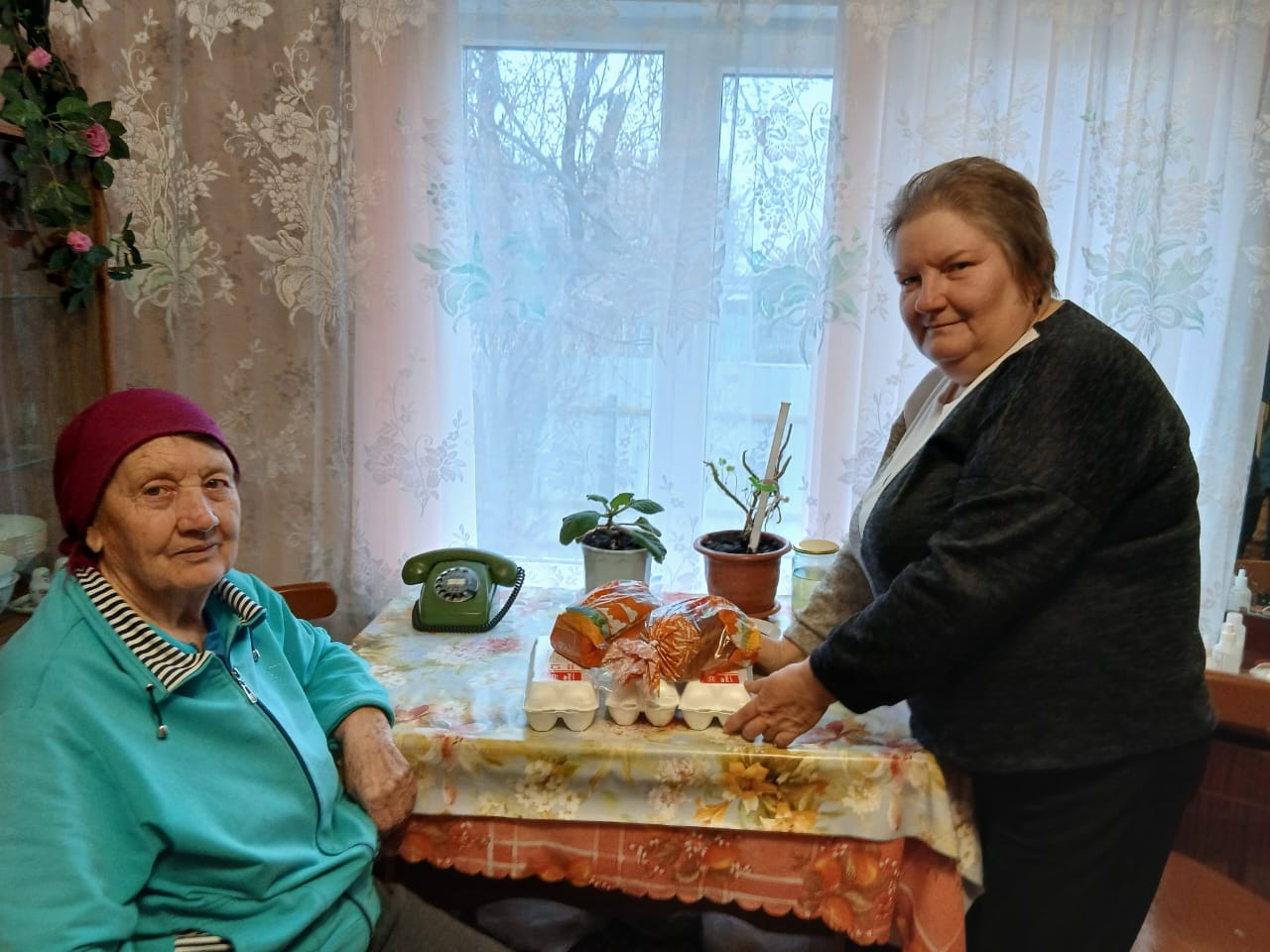 На фото социальный работник Золкина О. оказывает социальную услугу: доставка продуктов питания за счет получателя социальных услуг.