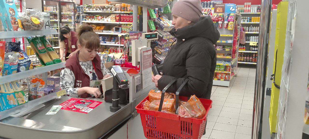 На фото социальный работник Савельева И. оказывает услугу: покупка и доставка за счет средств получателя социальных услуг продуктов питания, промышленных товаров первой необходимости, средств санитарии и гигиены, средств ухода, книг, газет, журналов.